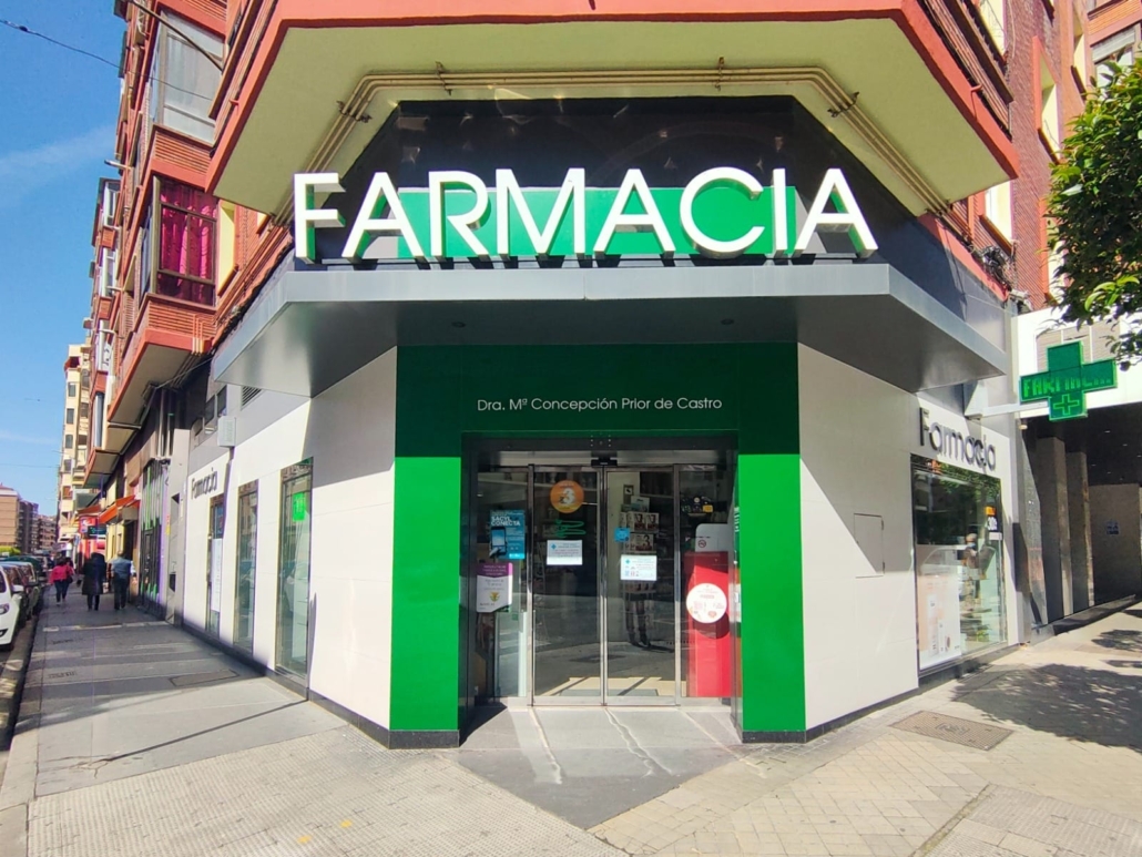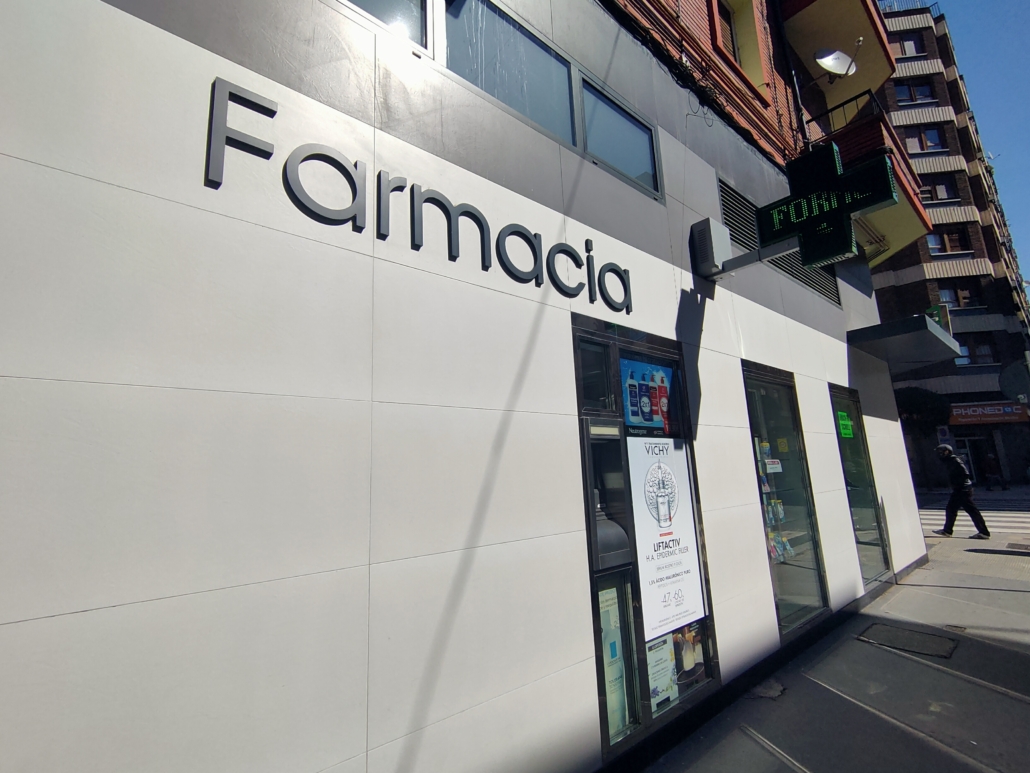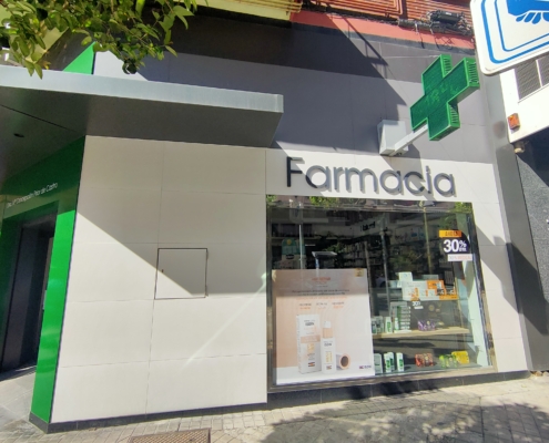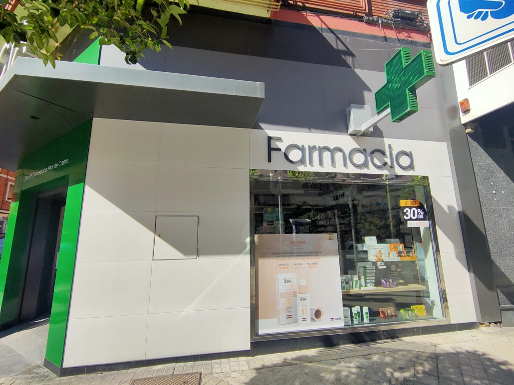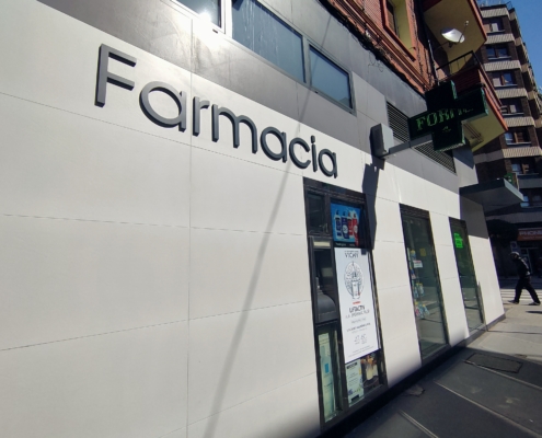 Reforma de la fachada de la Farmacia Prior en la Avda. Comuneros de Castilla de Miranda de Ebro. Rediseño de los huecos y acabados de fachada.